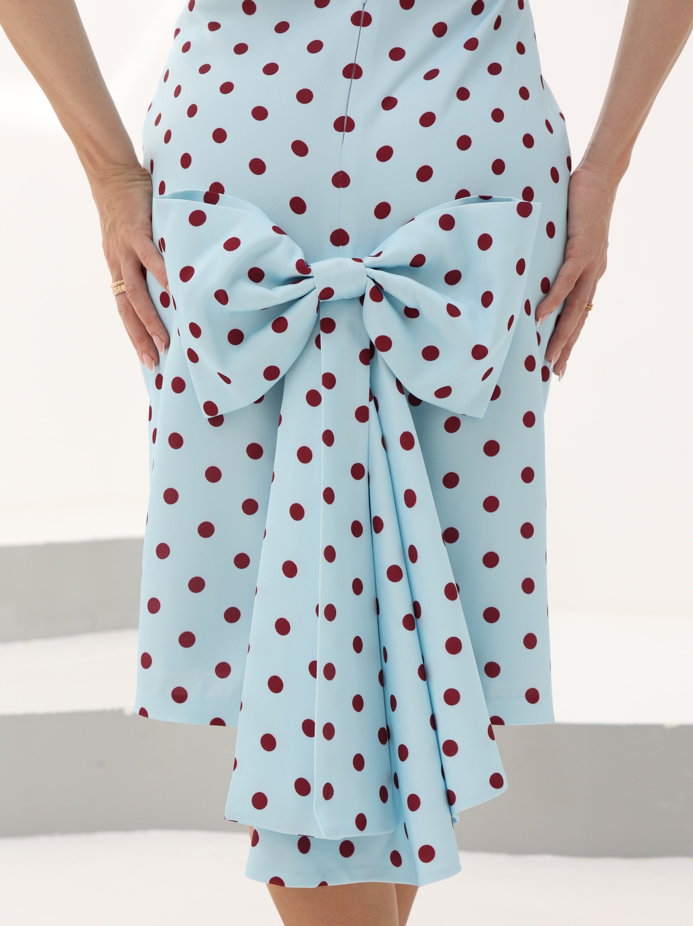 Baby blue polka-dot mini dress with a youthful bow at the back.