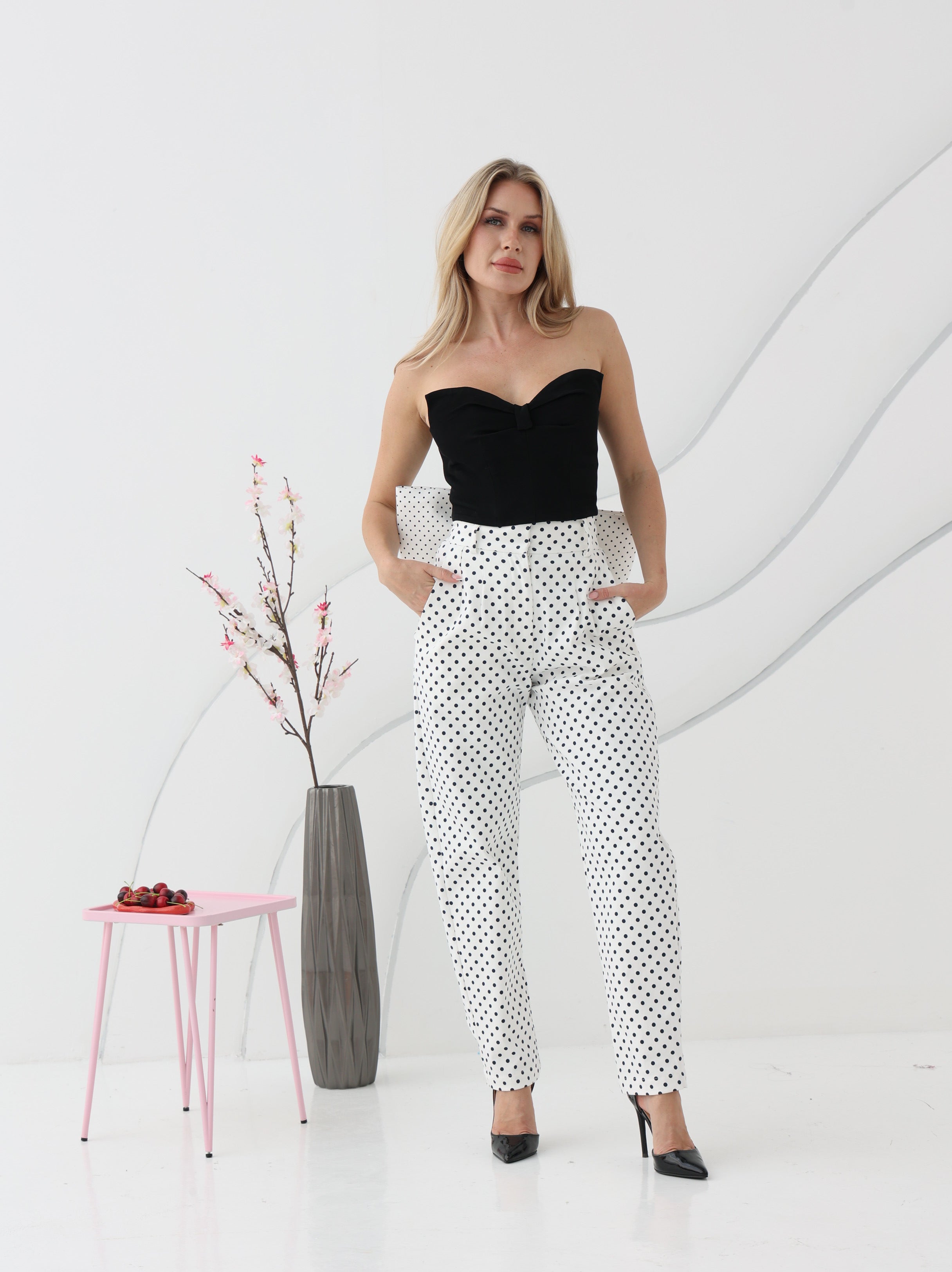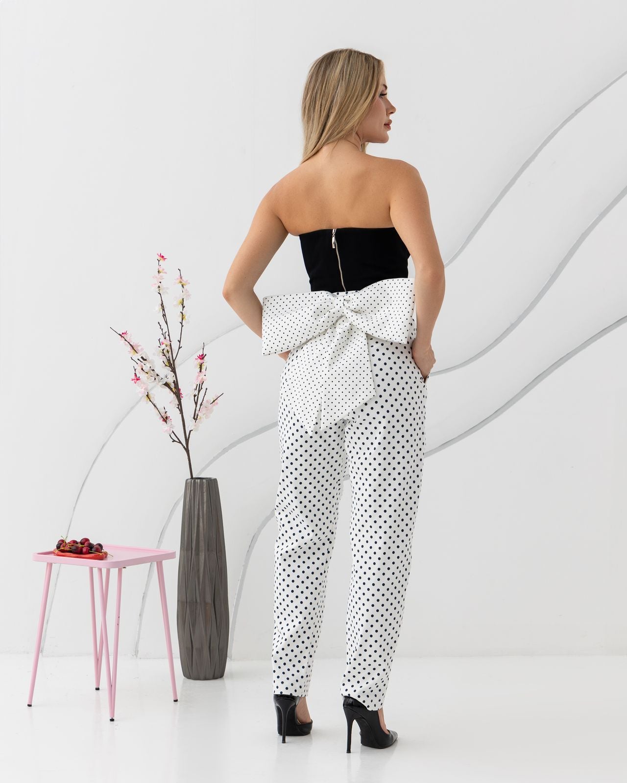 This piece is a symphony of contrasts—bold yet playful, structured yet flowing, nostalgic yet strikingly modern. The oversized bow cinches the waist like a whispered promise of elegance, evoking both the innocence of childhood and the confidence of a woman who commands attention without asking for it. The black bodice, sleek and bare-shouldered, is a quiet rebellion against the softness of the polka dots, a reminder that strength and grace are inseparable. She stands not just dressed, but adorned in self-assurance, wrapped in a moment that feels both timeless and fleeting