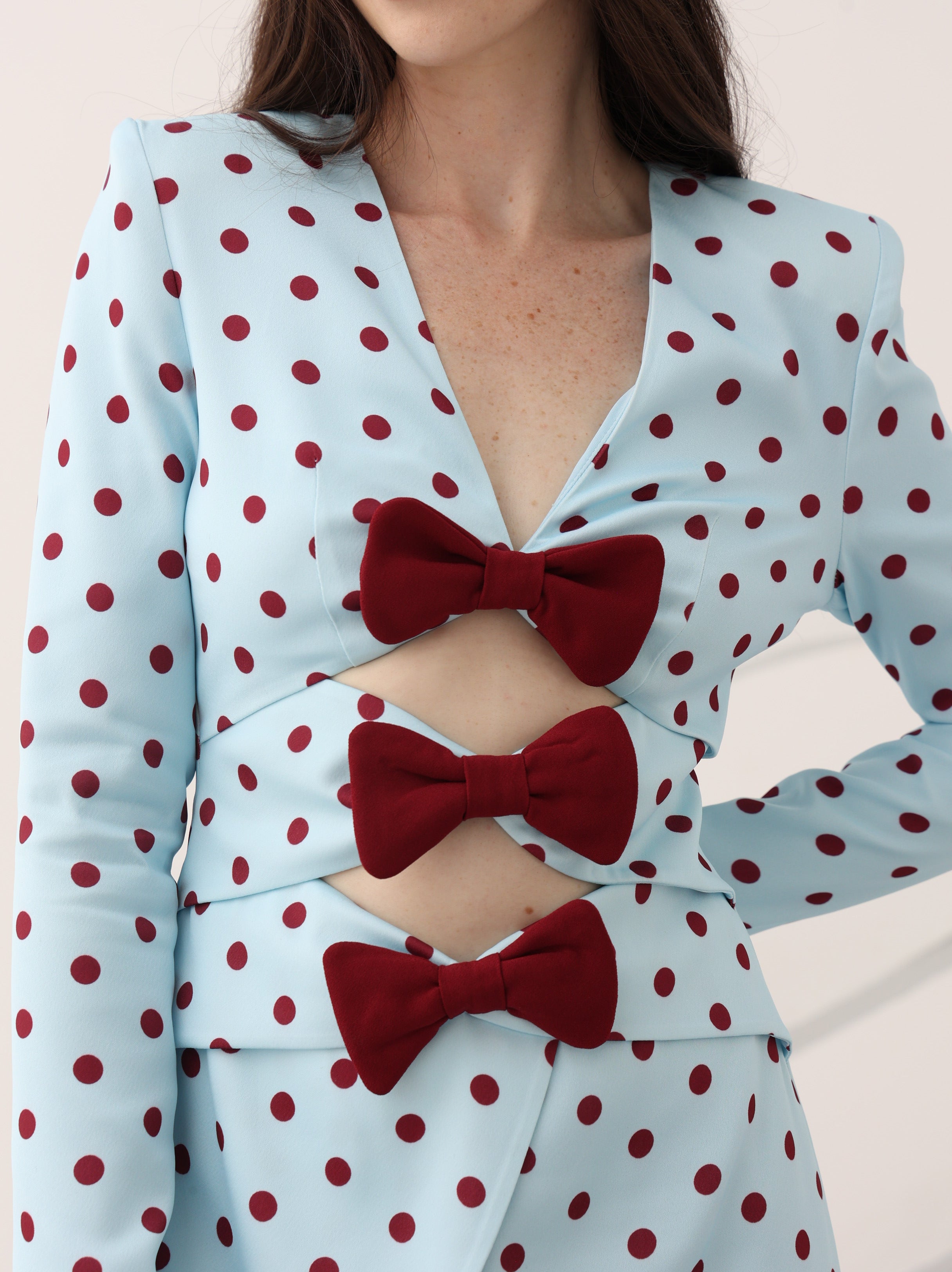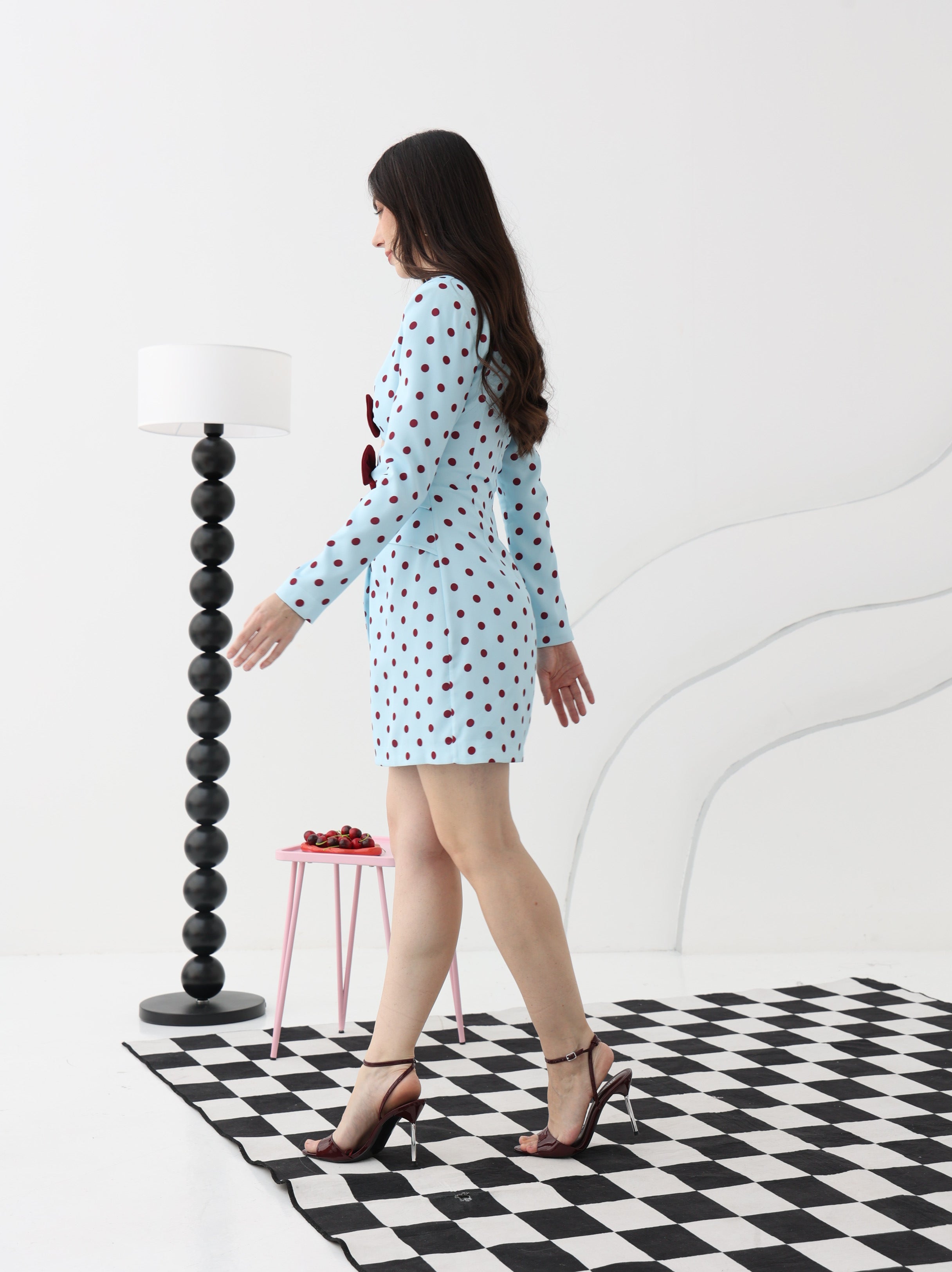 Satin baby blue polkadot sleeved, short dress with burgundy mini bows on a v bust cut.