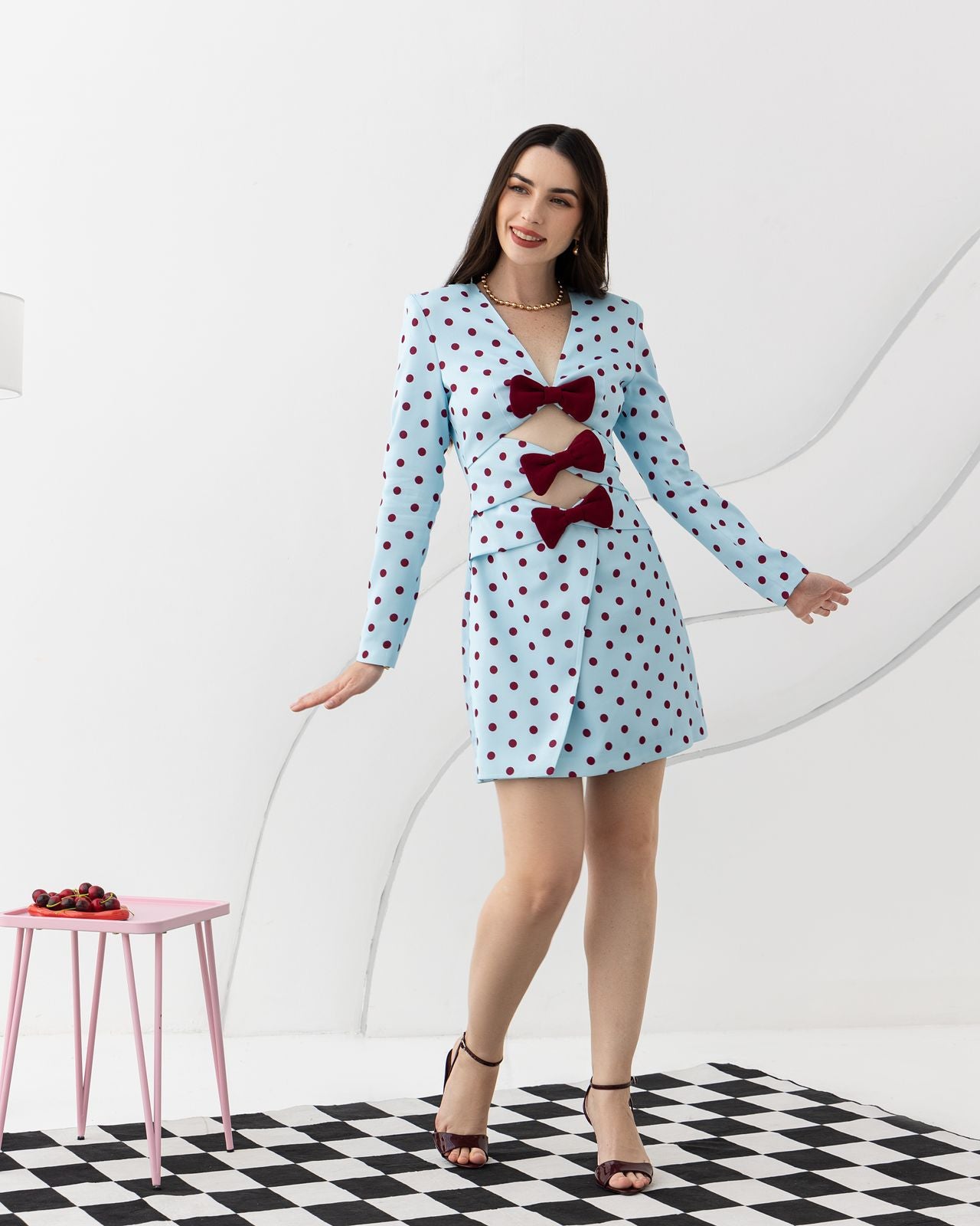 This dress is a celebration of bold femininity, where sharp tailoring meets a touch of mischief. The sky-blue fabric, kissed with rich crimson polka dots, feels both nostalgic and refreshingly modern. Three velvet bows delicately bridge daring cutouts, balancing sensuality with refinement in a way that feels effortless. It’s a piece that speaks of confidence, charm, and a woman who embraces both strength and spontaneity in equal measure.