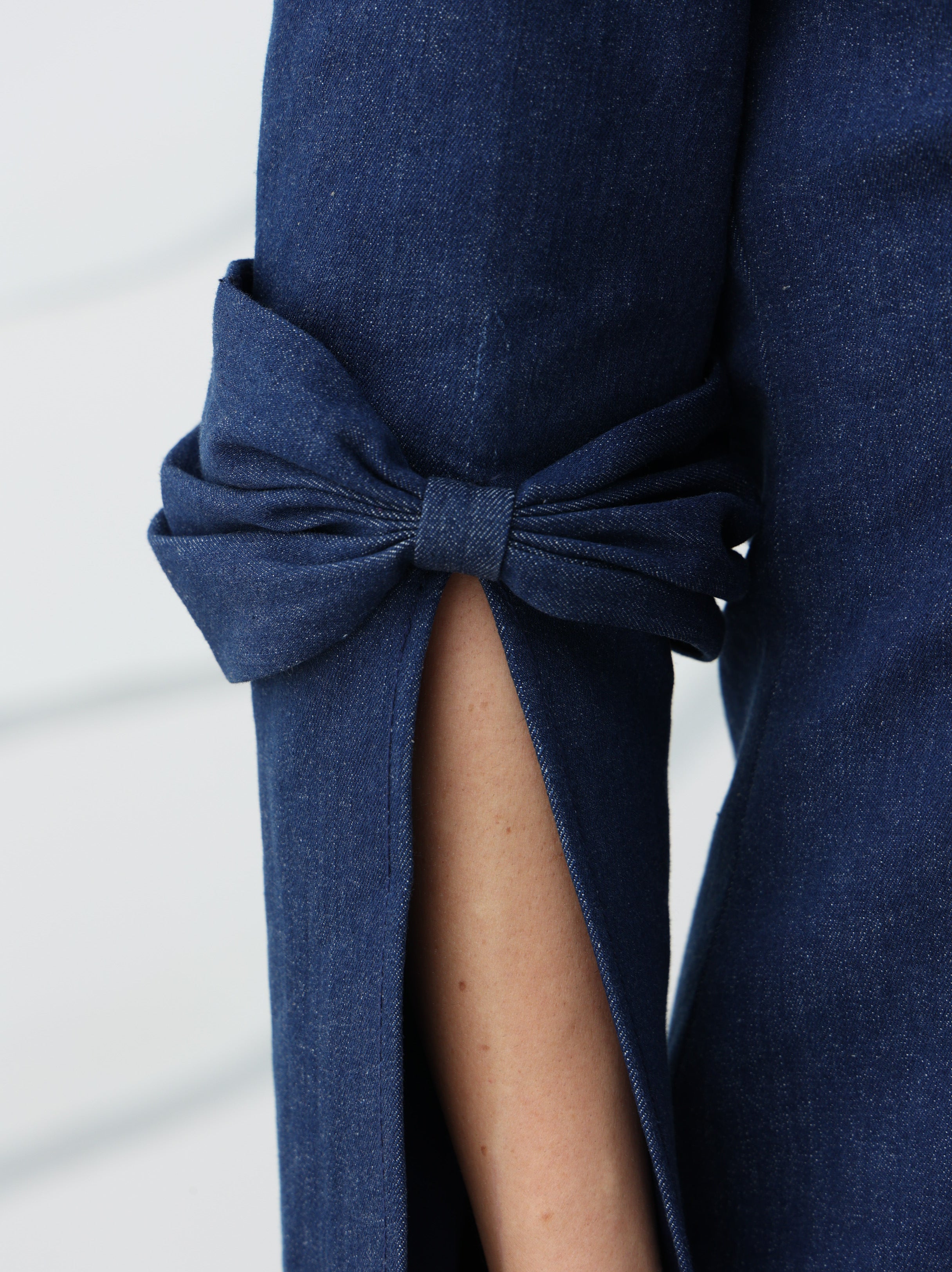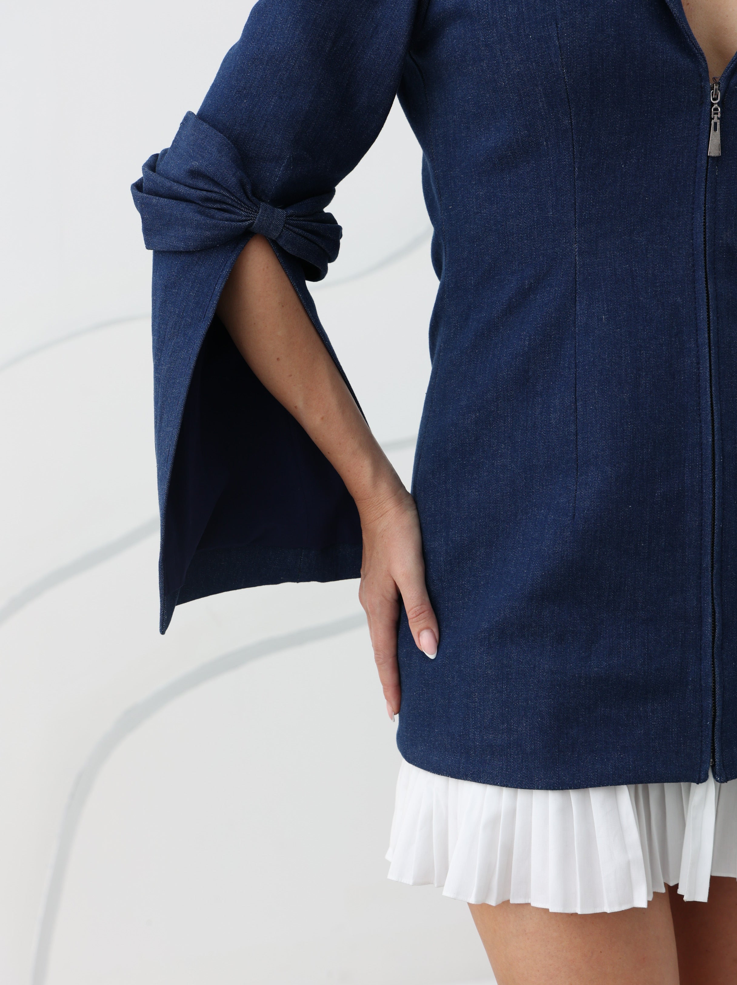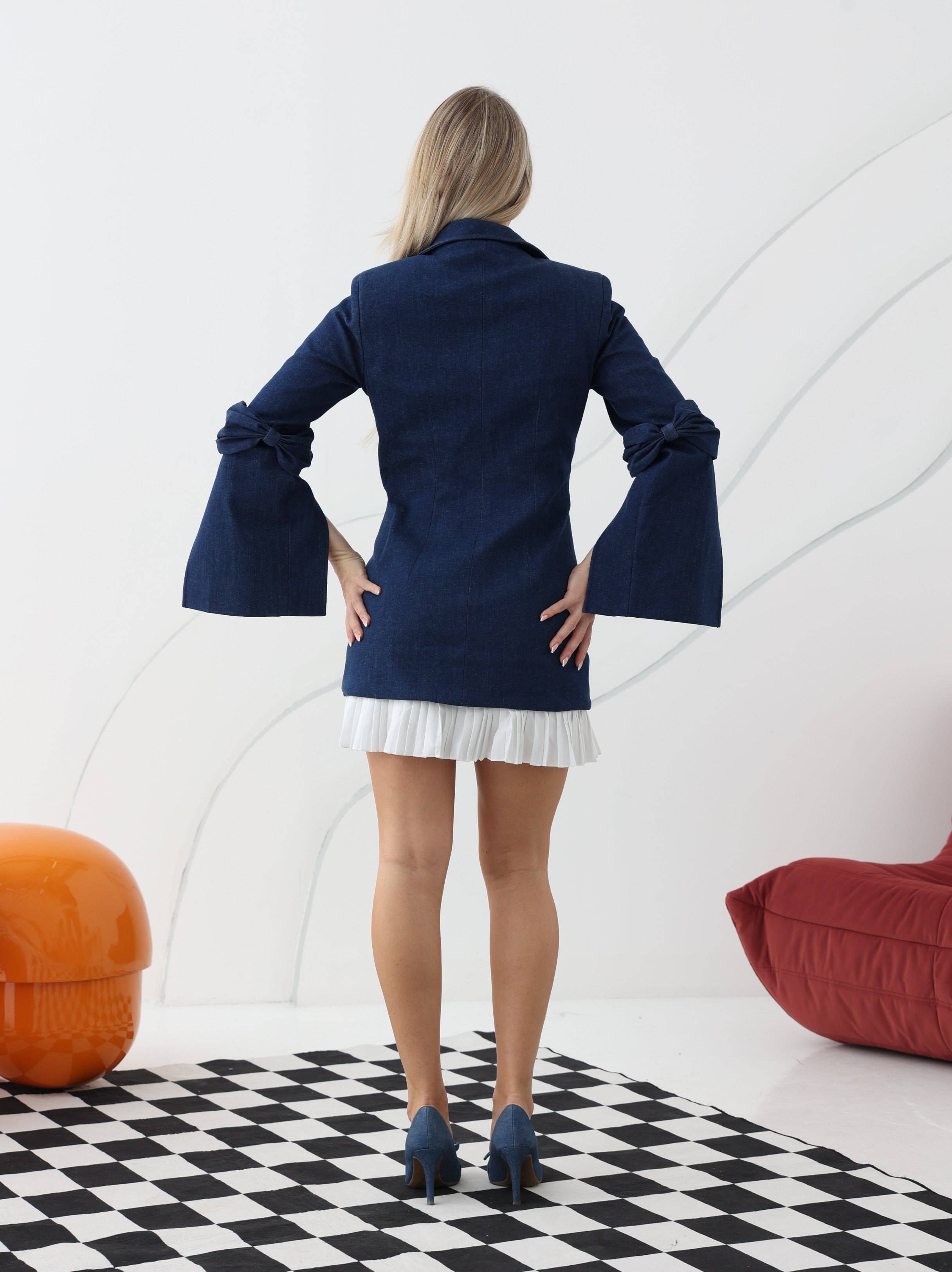 This look is power wrapped in playfulness, where denim takes on an entirely new identity. The deep indigo fabric exudes confidence, while the flared, open sleeves add a dramatic flair, like wings ready to take flight. A crisp pleated hem peeks out from beneath, softening the edge with a touch of movement and lightness. It’s an outfit that doesn’t follow rules—it rewrites them, blending strength and spontaneity in a way that feels completely unstoppable.