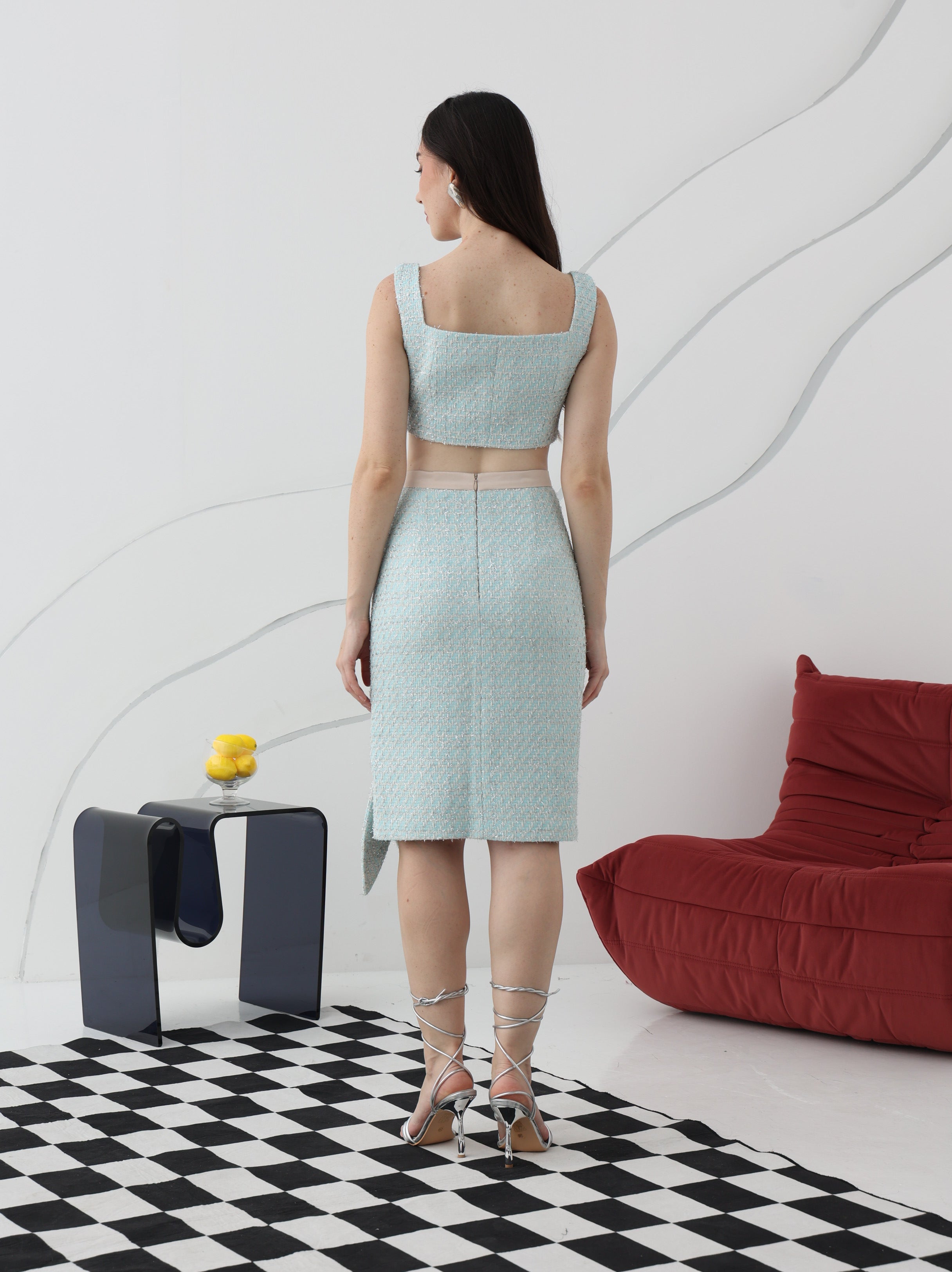 This skirt is a quiet expression of grace, where classic tailoring meets a touch of whimsy. The soft tweed fabric shimmers with subtle metallic threads, catching the light like a whispered secret. A delicately folded bow graces the hem, adding a sculptural detail that feels both playful and intentional. It’s an effortless blend of poise and personality, designed for a woman who carries elegance with ease.